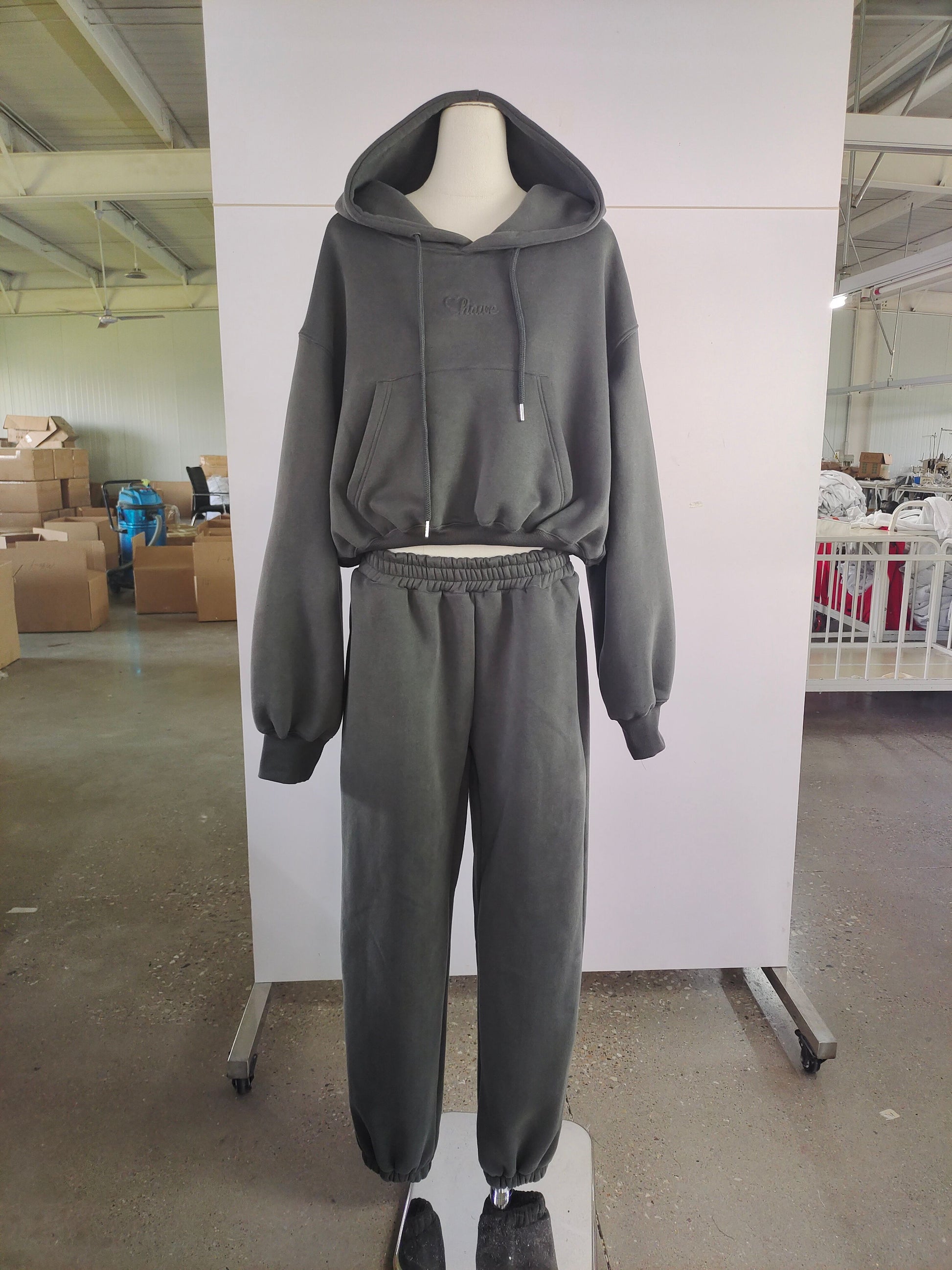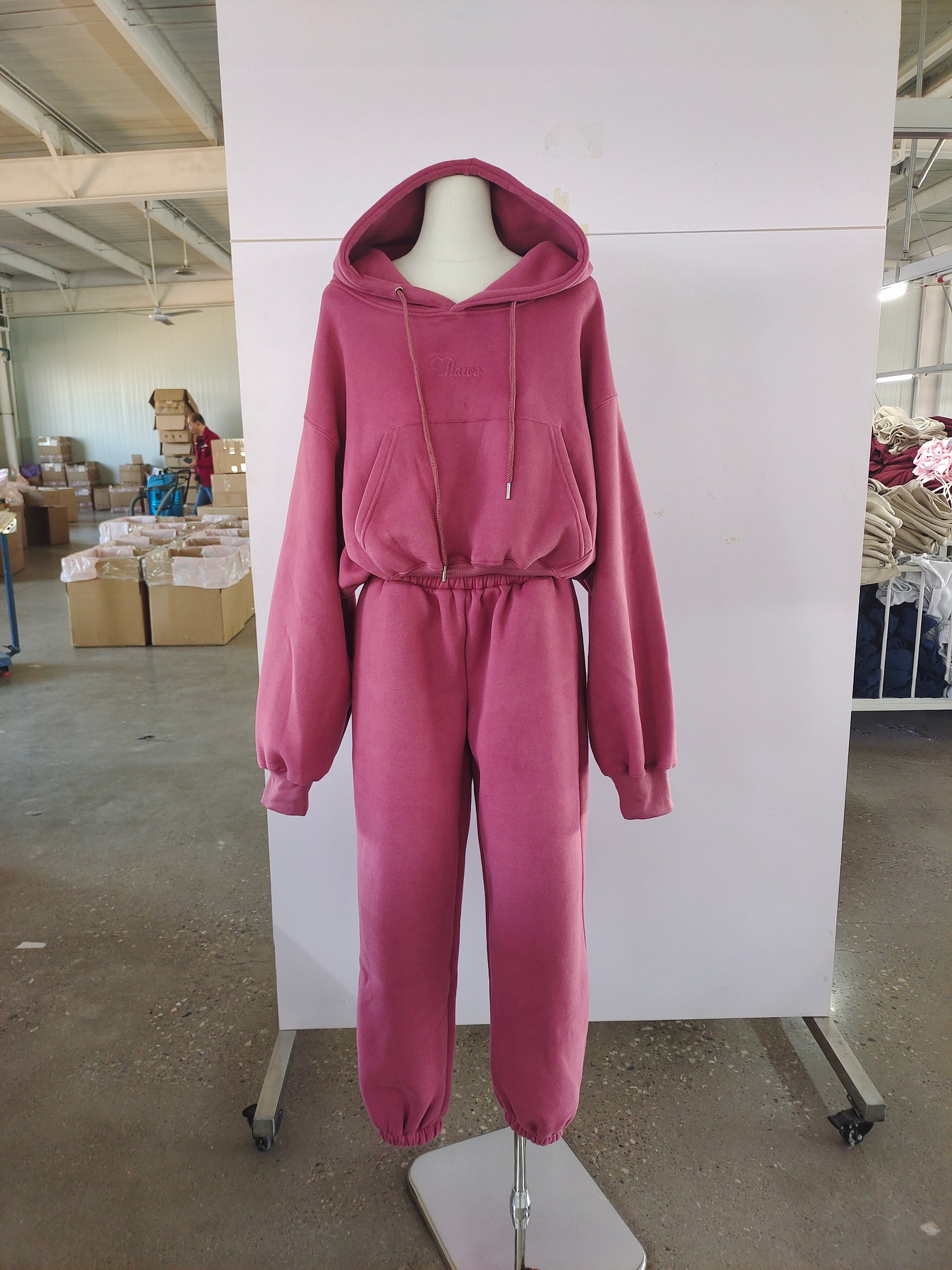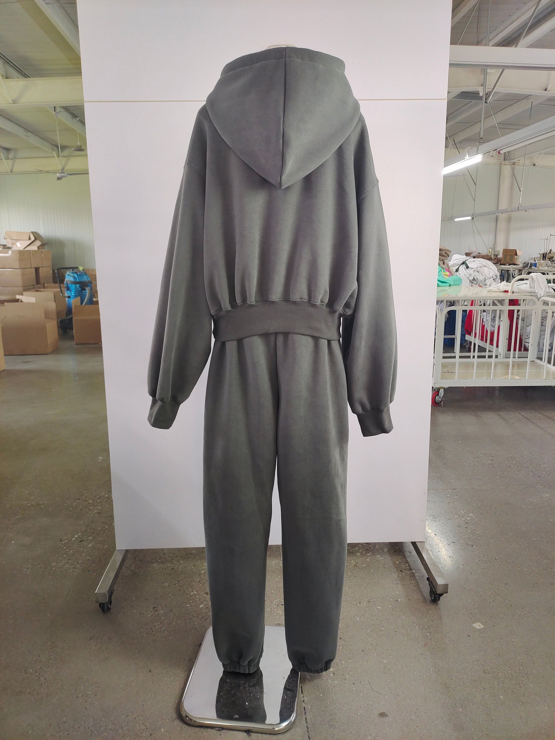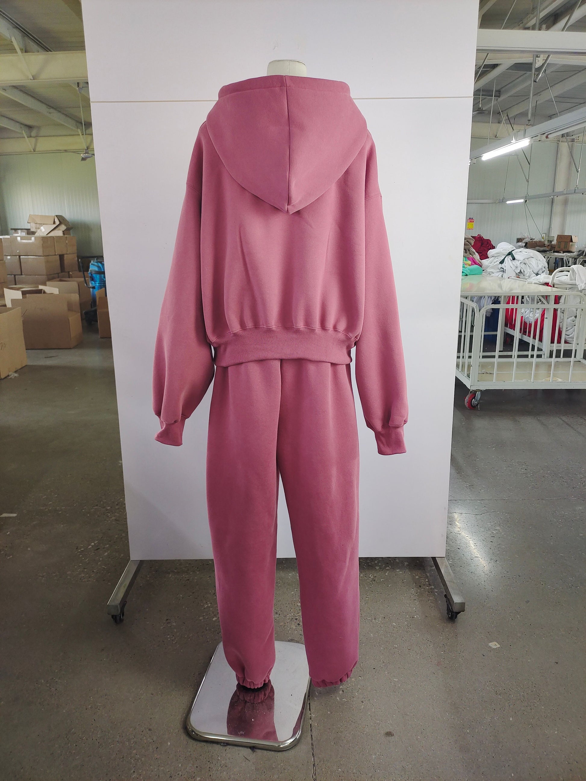 Oversized hoodie sa spuštenim ramenima, kapuljačom i prednjim džepom daje moderan, opušten kroj, dok donji dio s elastičnim strukom i suženim nogavicama s manžetama osigurava balans između udobnosti i ženstvene siluete.