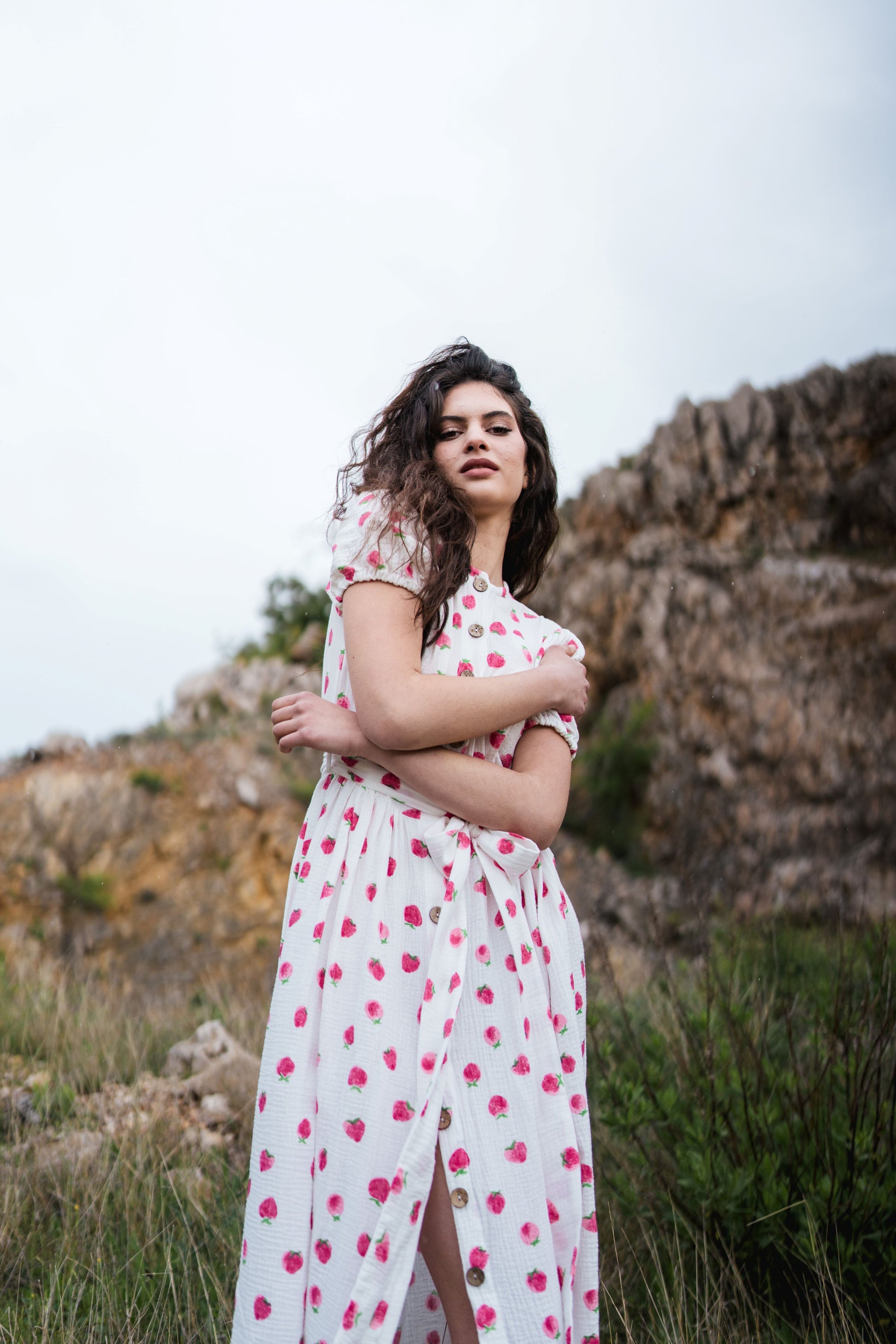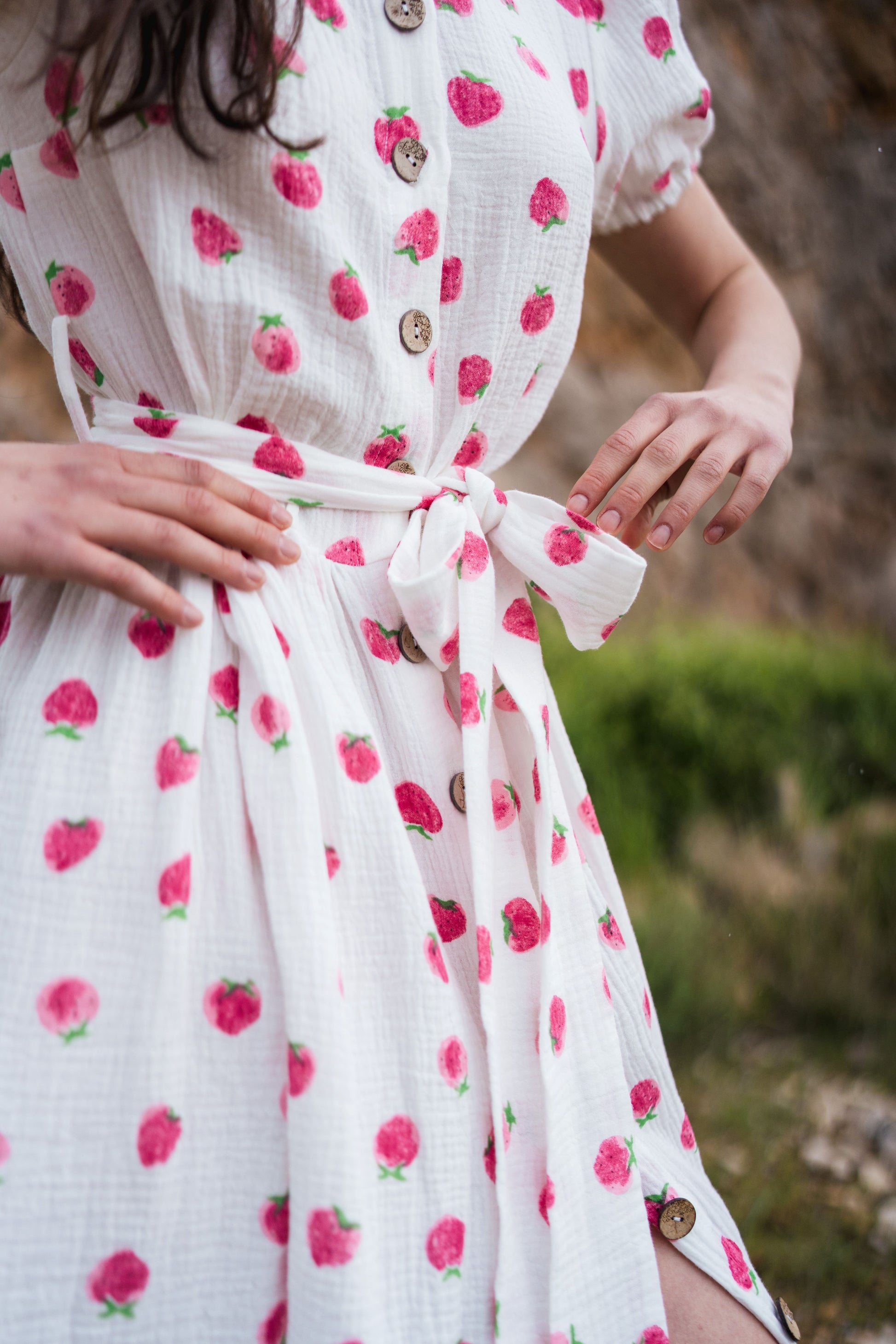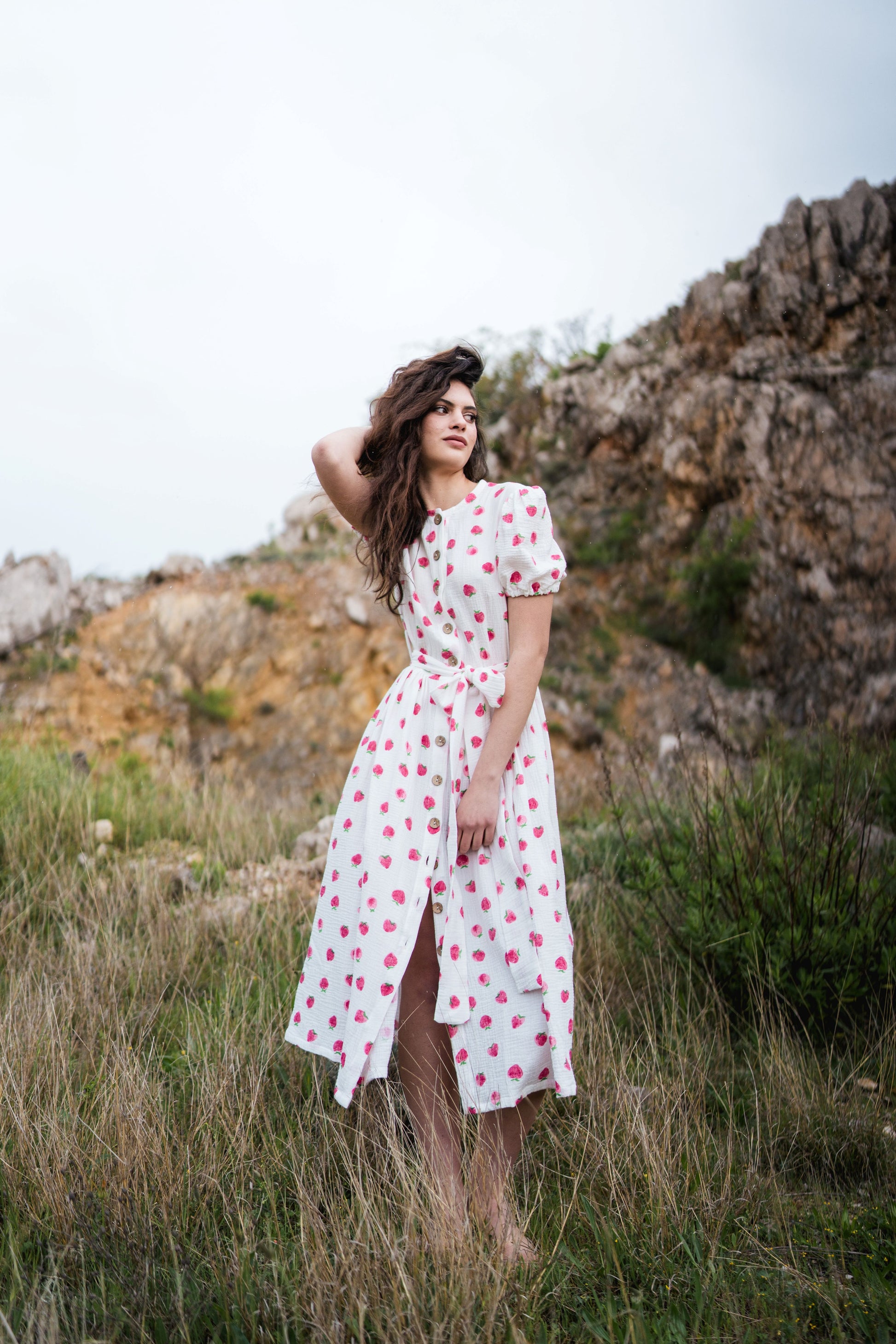 Questo abito in mussola leggero e arioso è la scelta perfetta per le giornate calde. Con maniche corte e taglio lungo, regala comfort ed eleganza in ogni movimento. Regolabile in vita per una vestibilità perfetta e per mettere in risalto la figura. È ideale per le passeggiate quotidiane, la spiaggia o gli incontri rilassati.