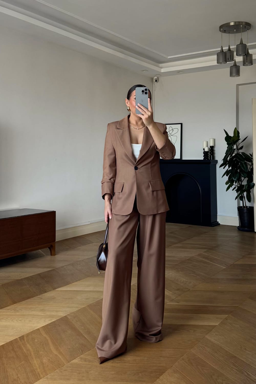 Elegantno, moderno i samouvjereno — ovo smeđe odijelo ističe tvoju profinjenost u svakom koraku. Savršen spoj klasičnog kroja i suvremenog stava. Udobno, chic i uvijek spremno za tvoj next move.