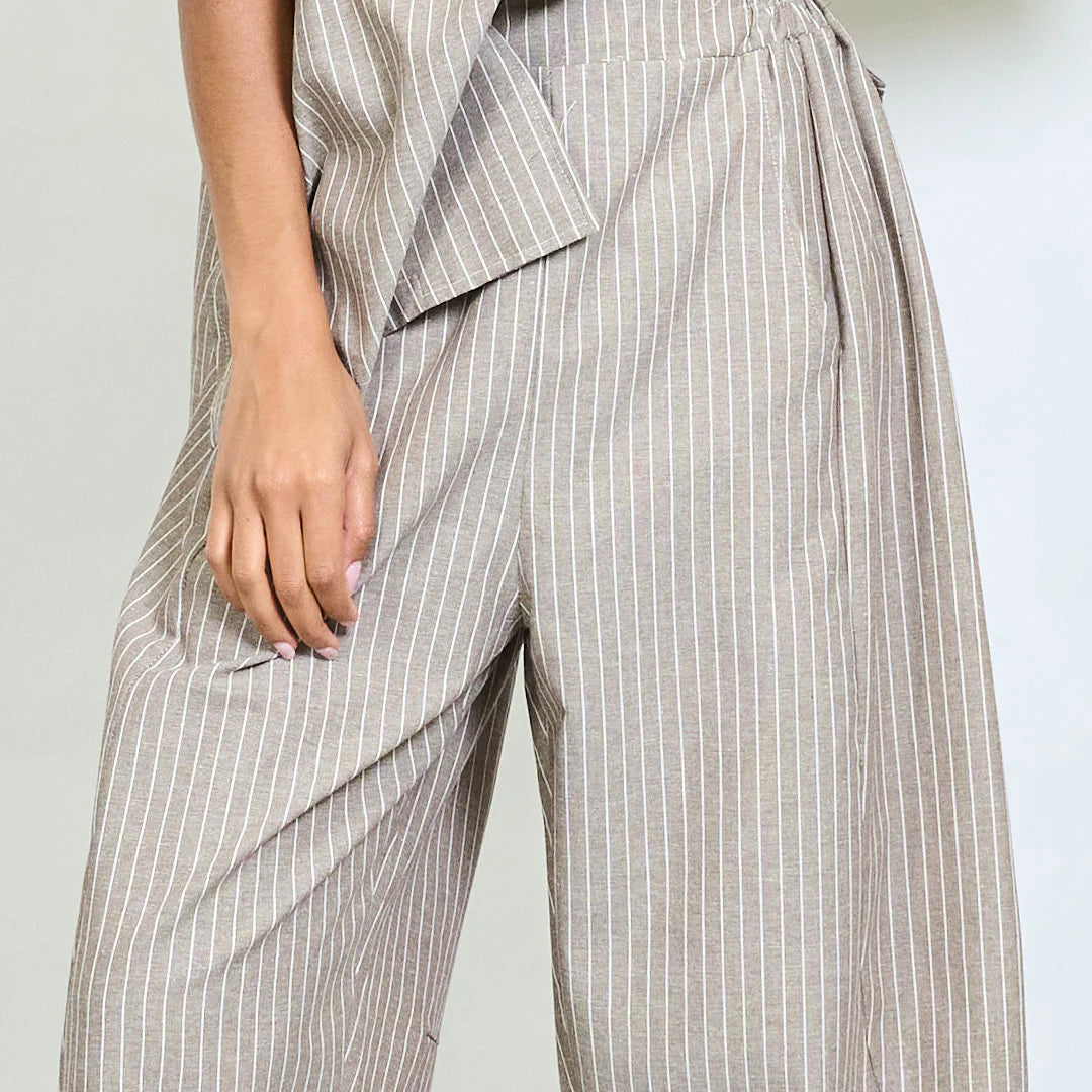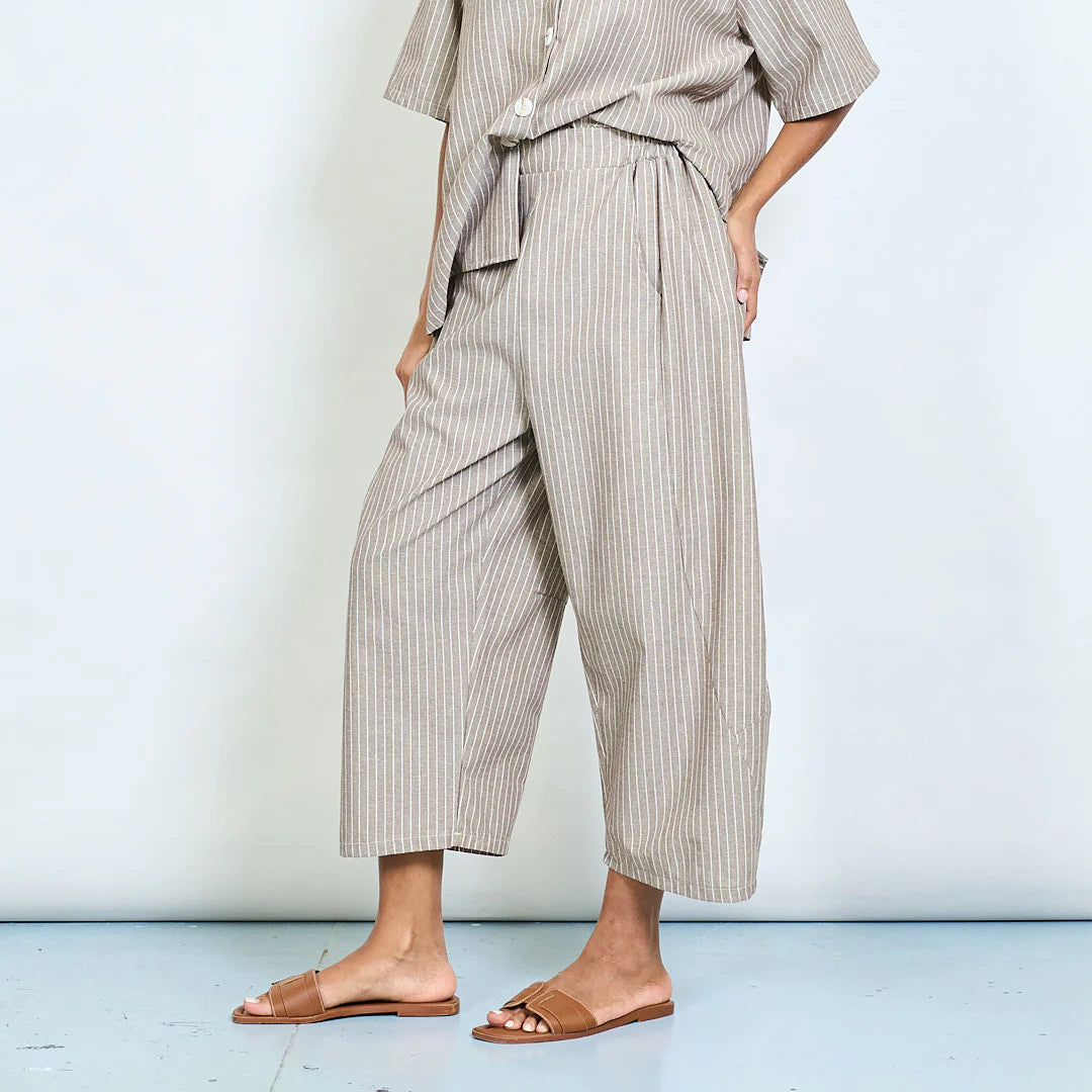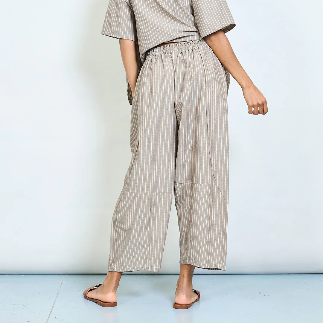 Ležerne, široke hlače od stopostotnog pamuka s elastičnim pojasom i prugastim uzorkom. Lagane, udobne i idealne za toplije dane.