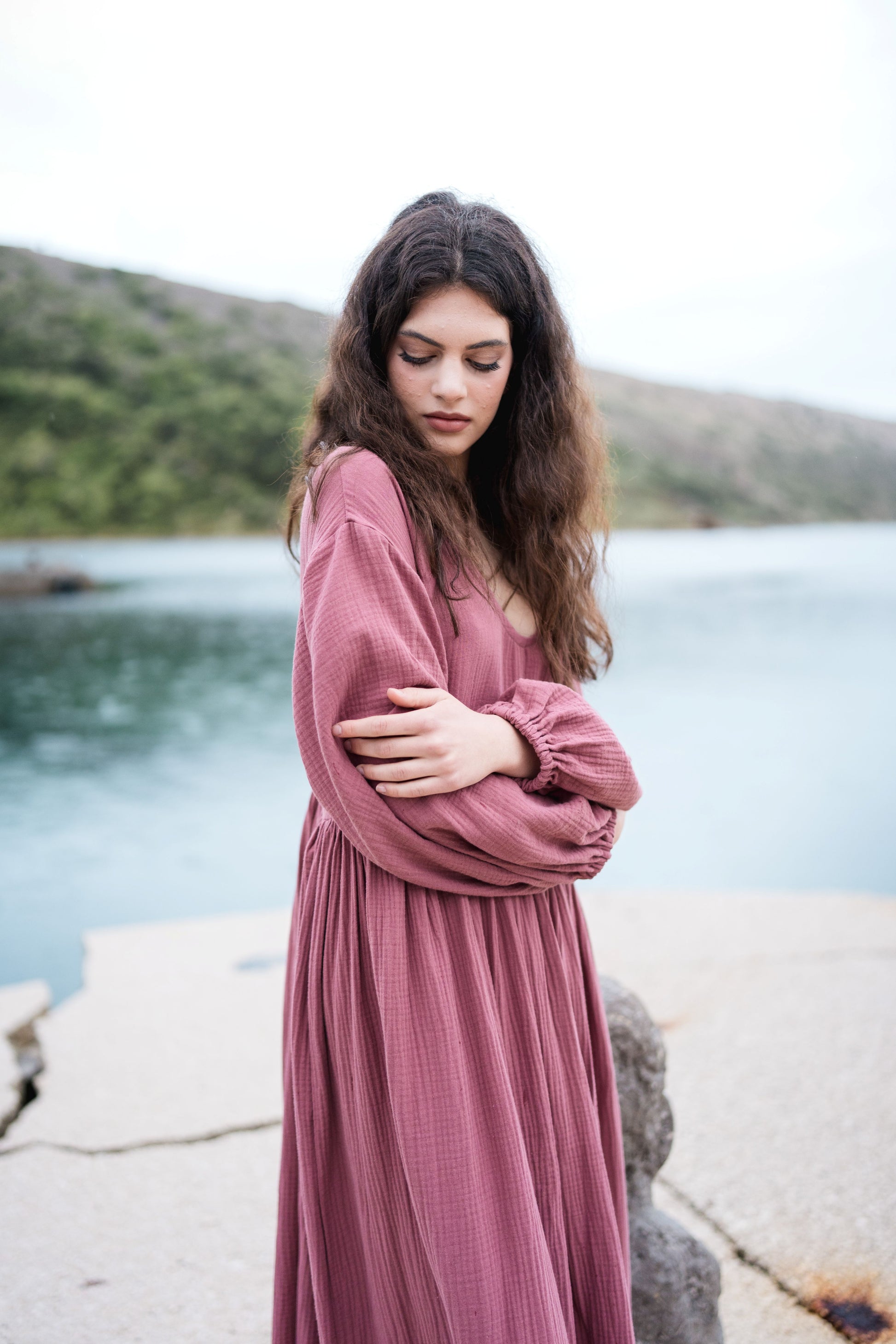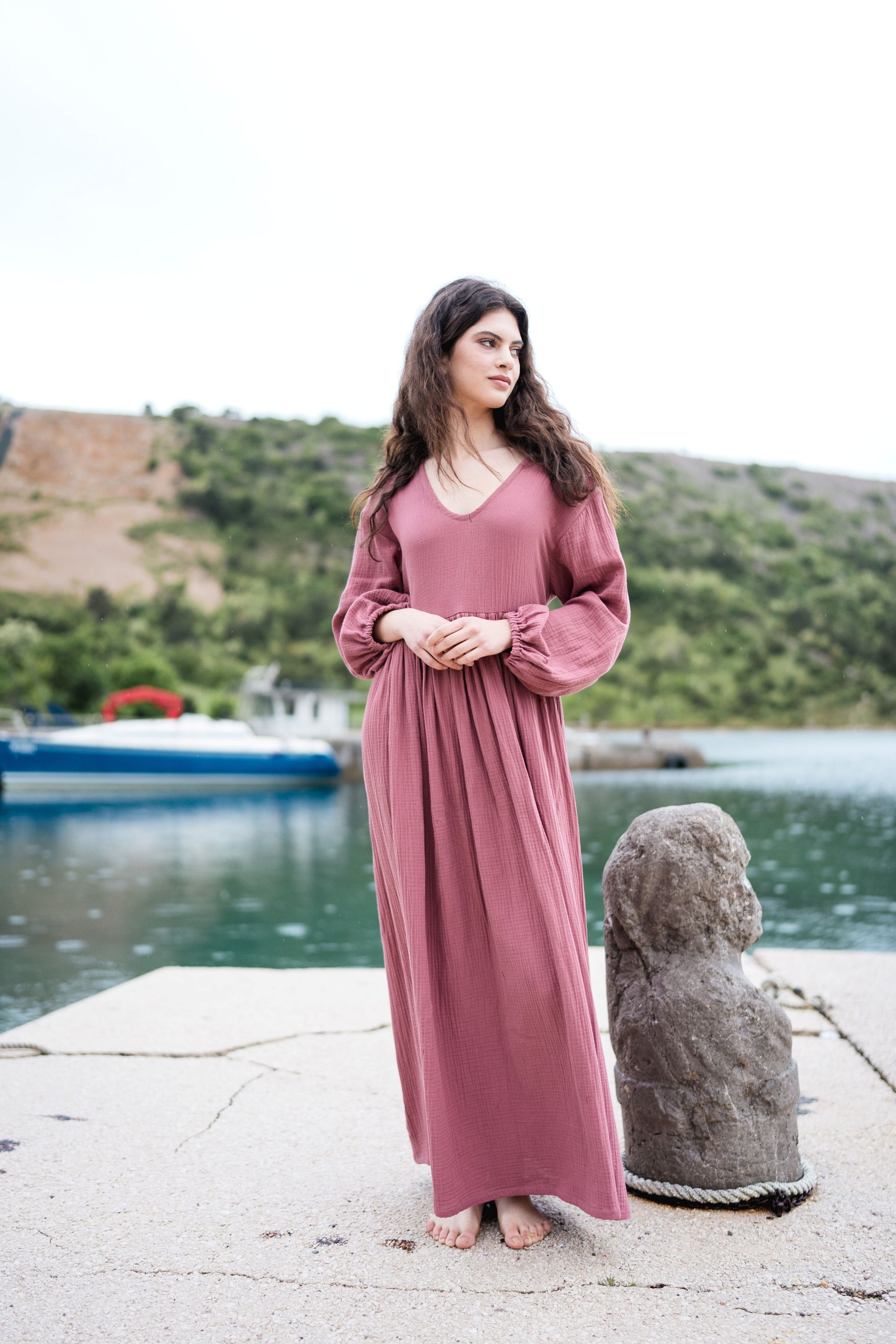 Elegantna duga muslin haljina u boji cigle, dugih rukava, s prorezom na leđima i vezanjem u struku. Lepršava, lagana i ženstvena – savršen izbor za tople dane i posebne prilike. Istakni svoj stil s lakoćom!